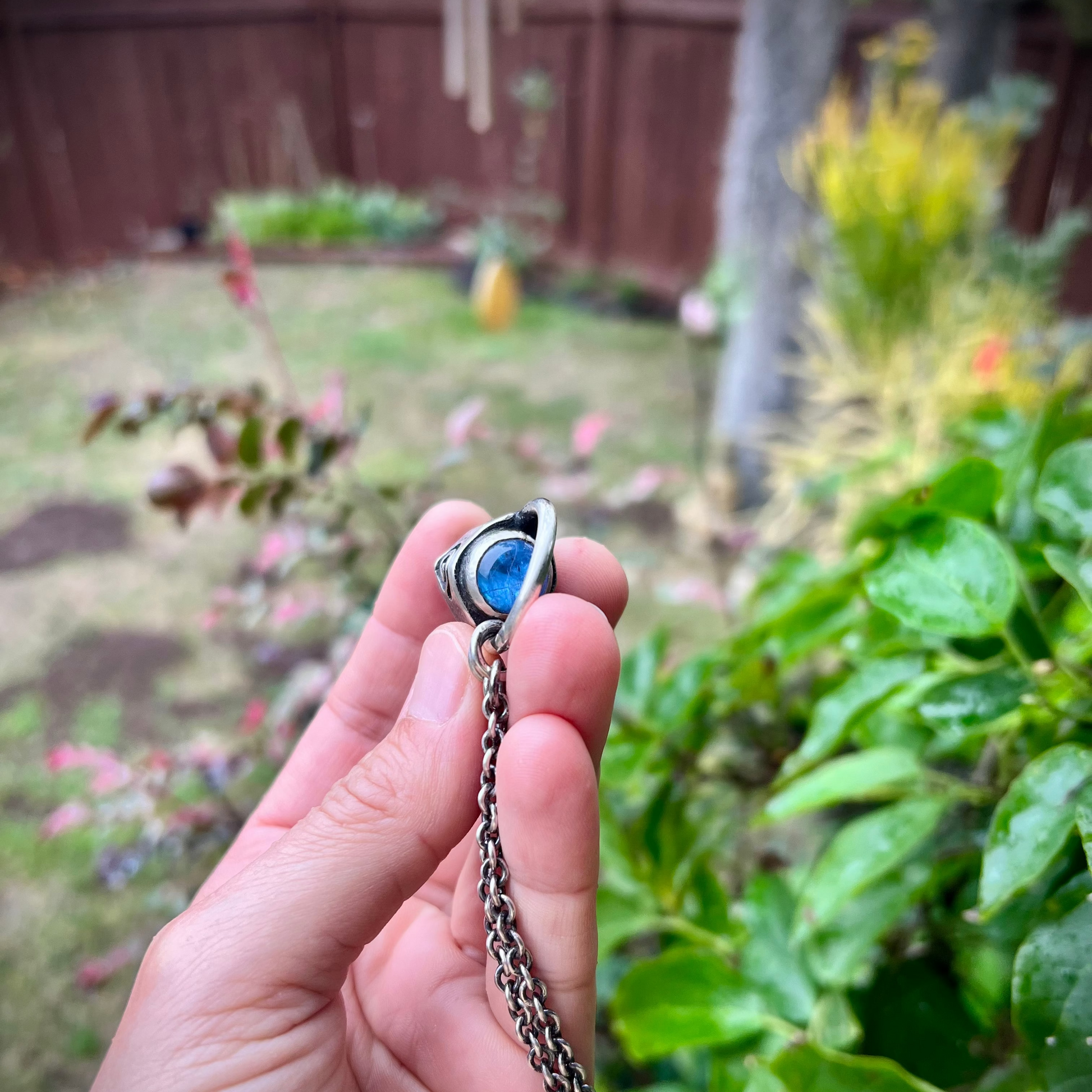 Hand fabricated sterling silver talisman featuring Blue Topaz and Amethyst with a swirl design.